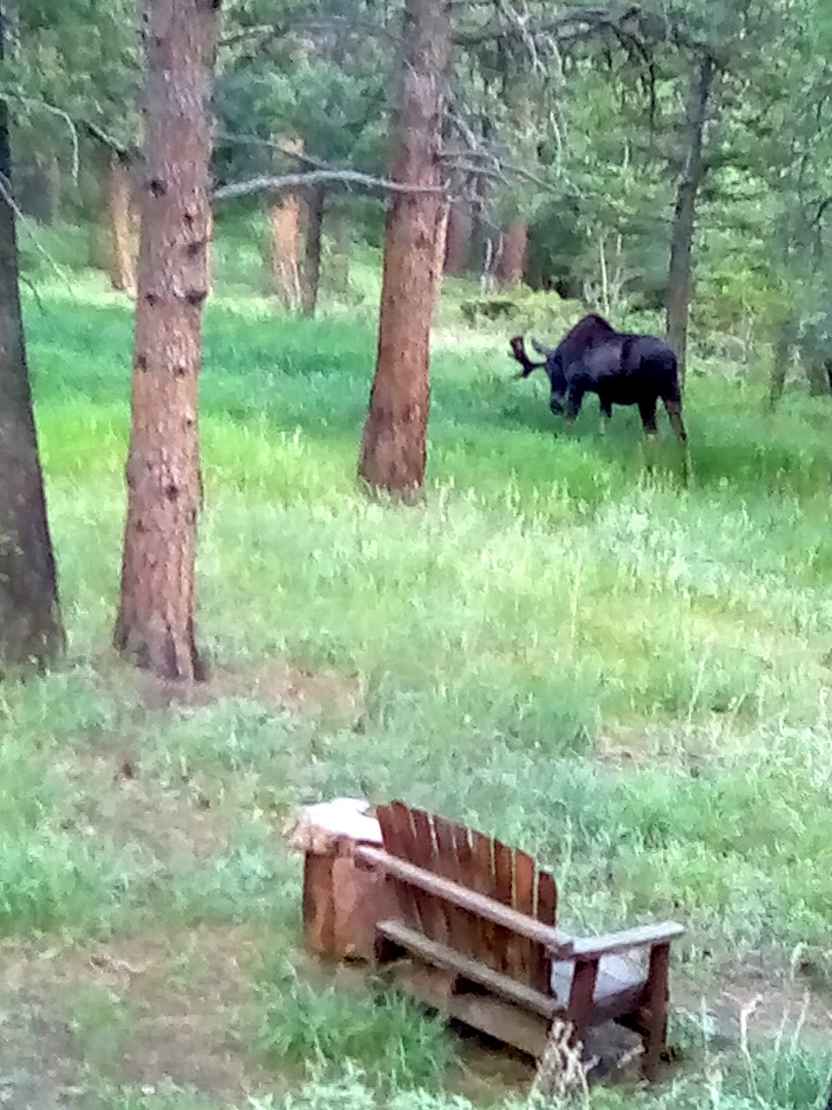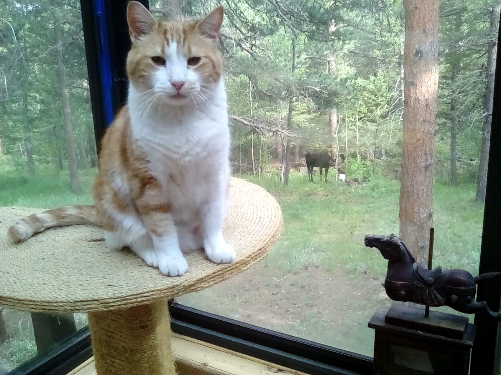 Close up of moose licking salt lick and being followed by a smaller moose calf in "Cat and Moose" photo. The cat in the original picture is Pistol the cat.